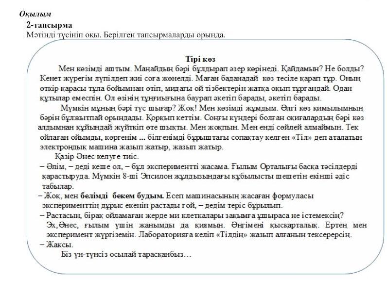 Көз адамға керек маңызды мүше.Ол арқылы біз көзбен айналаны көре аламыз.Тірі көз әрқашанда адамда болады.Біз өз көзімізді жаман заттардан сақтауымыз керек.Олардың бәрі көзге кері әсер тигізеді.Тірі көз арқылы жыпылықтап,не қарай аламыз.Көзіміз бәрін көре алады.Көз адамның жалғыз көру мүшесі.Көздер жанары болады,олар арқылы көз жұмыла алады.Біз көзбен әрқашанда жан жақтың сұлулығына тамсана аламыз.Әркім көзі бар болғанына қуануы керек.Себебі,ол тек екеу ақ.