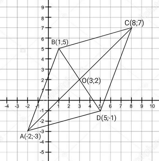 Найдите координаты вершины D (х; у) параллелограмма ABCD, если известны координаты трёх других его вершин: А (- 2; - 3), В (1; 5), С (8; 7)
