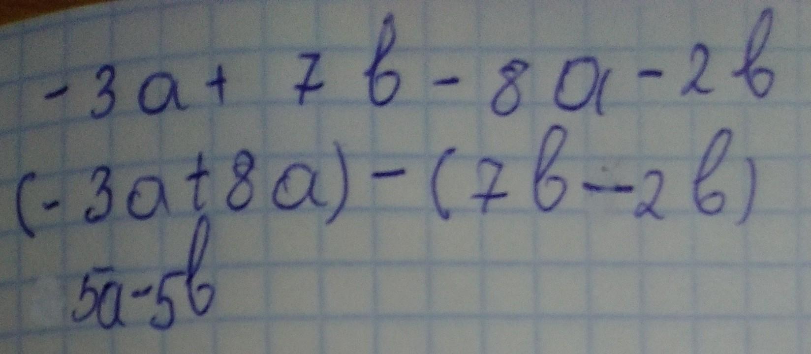–3a + 7b – 8a – 2b = (–3a – 8a) + (7b – 2b) = (–3 – 8)a + (7 – 2)b = –11a + 5b