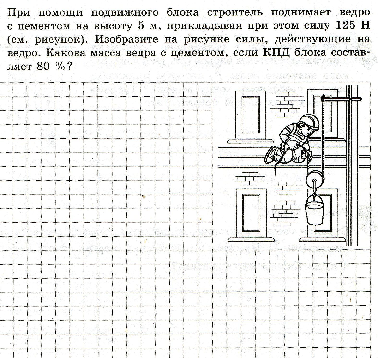 Поскольку это подвижный блок, то для поднятия груза на 5 метров необходимо переместить свободный конец верёвки в два раза дальше L=5*2=10 м. Но сила при этом прикладывается в два раза меньше, чем вес ведра с песком.