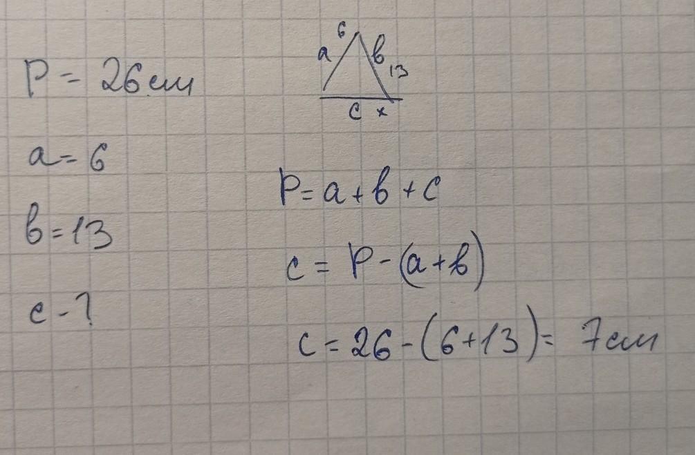 Периметр треугольника равен 26см сторона а=6см сторона В=13см чему равна сторона с_? А)7см В)12см С)8см Д)19см