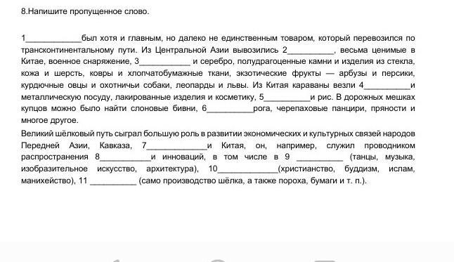 Великий шёлковый путь сыграл большую роль в развитии экономических и культурных связей народов Передней Азии, Кавказа, Средней Азии и Китая, он, например, служил проводником распространения технологий и инноваций, в том числе в искусстве (танцы, музыка, изобразительное искусство, архитектура), религии (христианство, буддизм, ислам, манихейство), технологии (само производство шёлка, а также пороха, бумаги и т. п.).