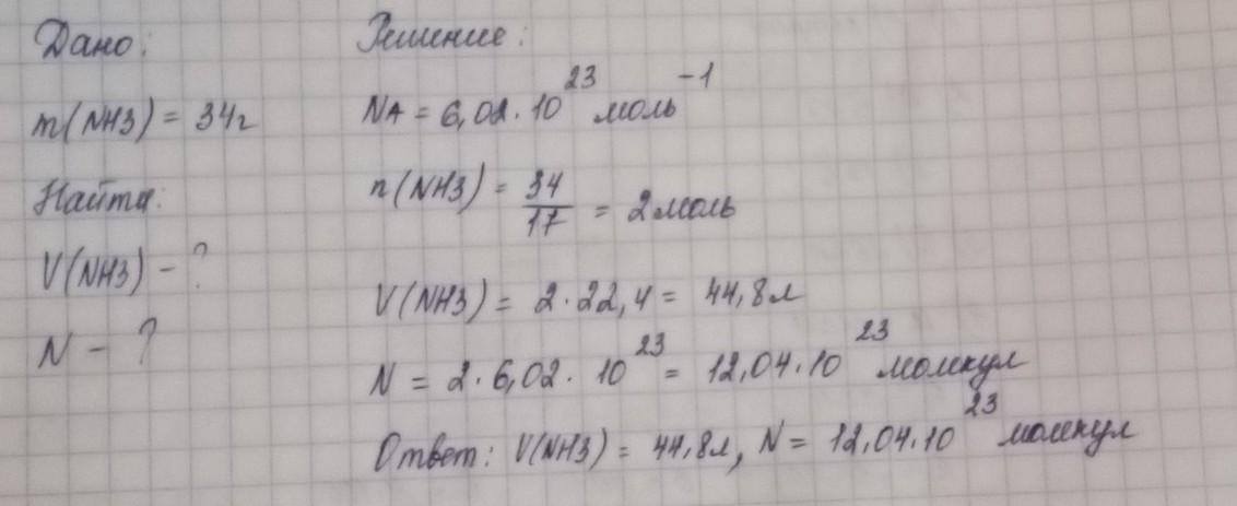 Какую объем занимают (н.у.) и сколько молекул содержится в 34 г аммиака NHз ?