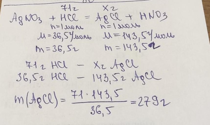 обчислити масу осаду який утвориться при взаємодії аргентум нітратом з хлоридною кислотою масою 71 г