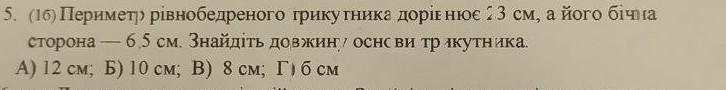 5. (16) Периметр рівнобедреного грику тника доріе нює 23 см, а його бічна сторона - 6,5 см, Знайдіть довжин / оснс ви тр кутника. A) 12 см, Б) 10 см;B В) 8 см3 Г)б см 6. (16)