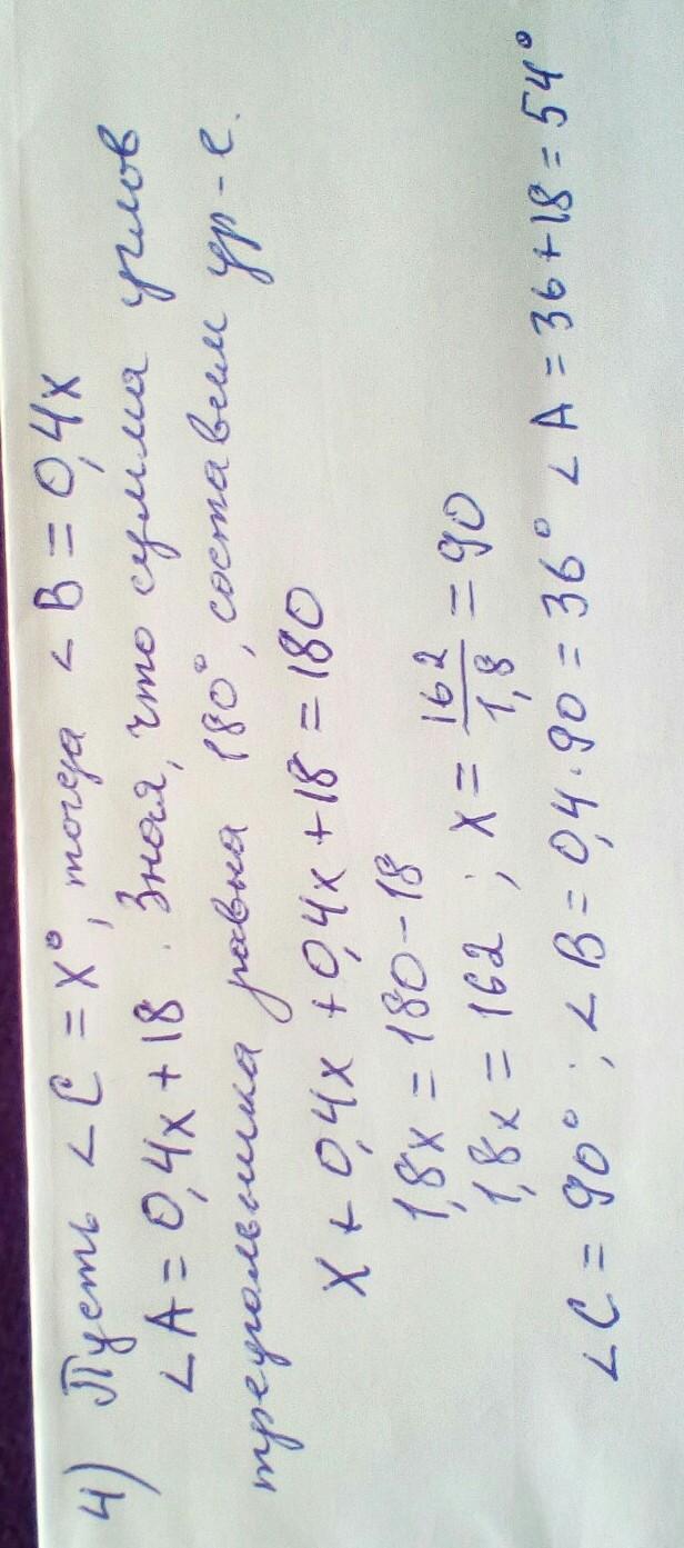 4) угол С это х, угол В =0,4х, угол А 0,4х+18