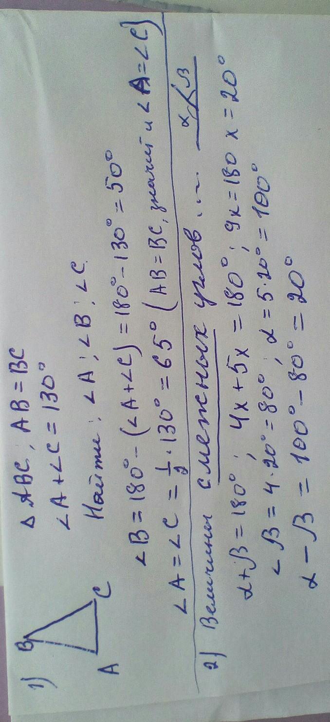 1)В равнобедренном треугольнике АВС с основанием АС сумма углов А и С равно 130 градусов. Найдите углы треугольника АВС