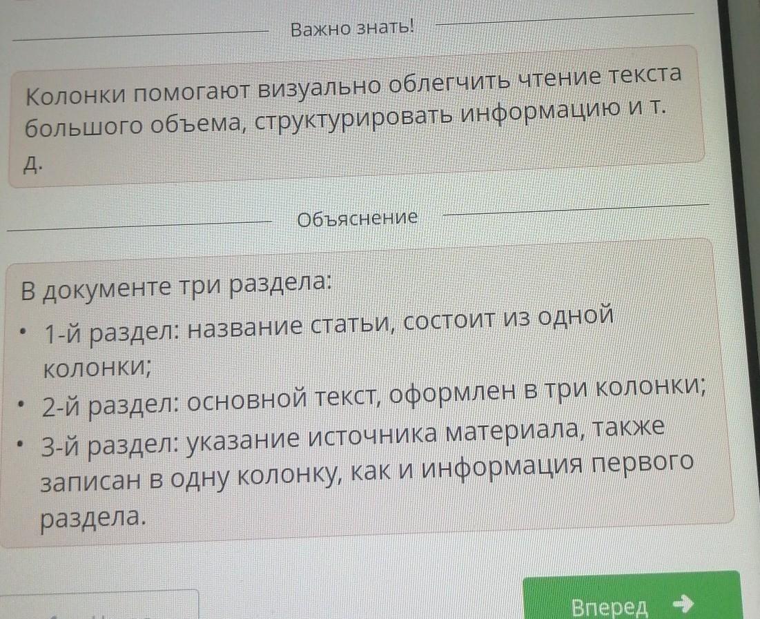 Определи количество колонок первого раздела документа, изображенного на рисунке.