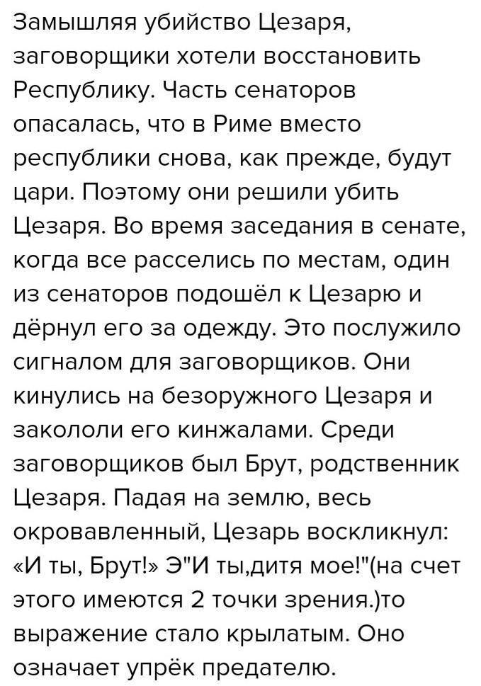 Группа сенаторов во главе с Гаем Кассием Лонгином и Марком Юнием Брутом организовала заговор, чтобы убить Цезаря и восстановить Республику. На заседании сената в иды марта заговорщики набросились на диктатора с кинжалами и нанесли ему 23 раны, от которых он умер на месте. э. в Риме. ... разгромил своих политических врагов и установил единоличную власть над Римской державой. Группа сенаторов во главе с Гаем Кассием Лонгином и Марком Юнием Брутом организовала заговор, чтобы убить Цезаря и восстановить Республику.