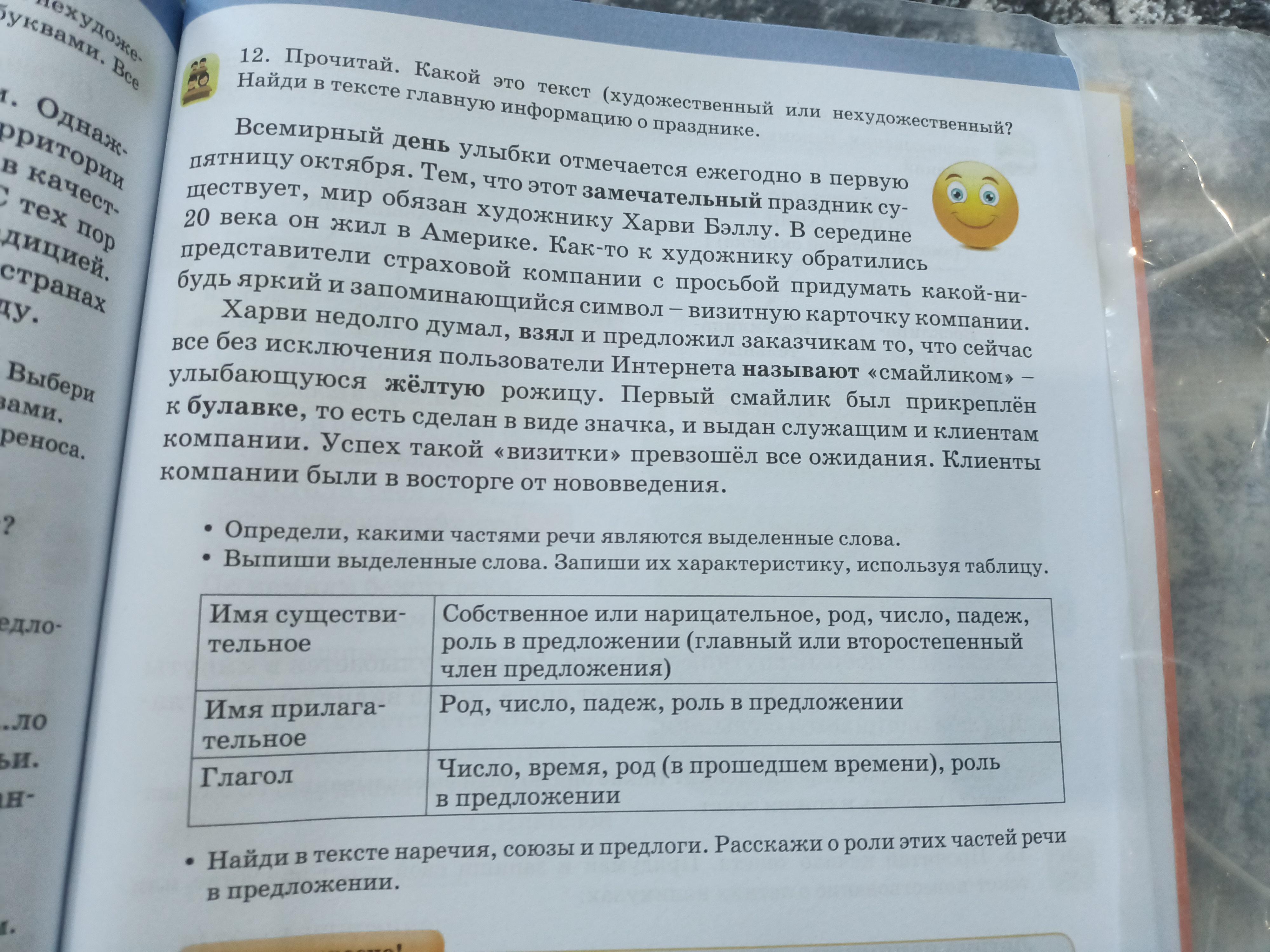 12. Прочитай какой это текст художественный или не художественный найди в тексте главную информацию о празднике • Выпиши выделенные слова запиши их характеристику используя таблицу