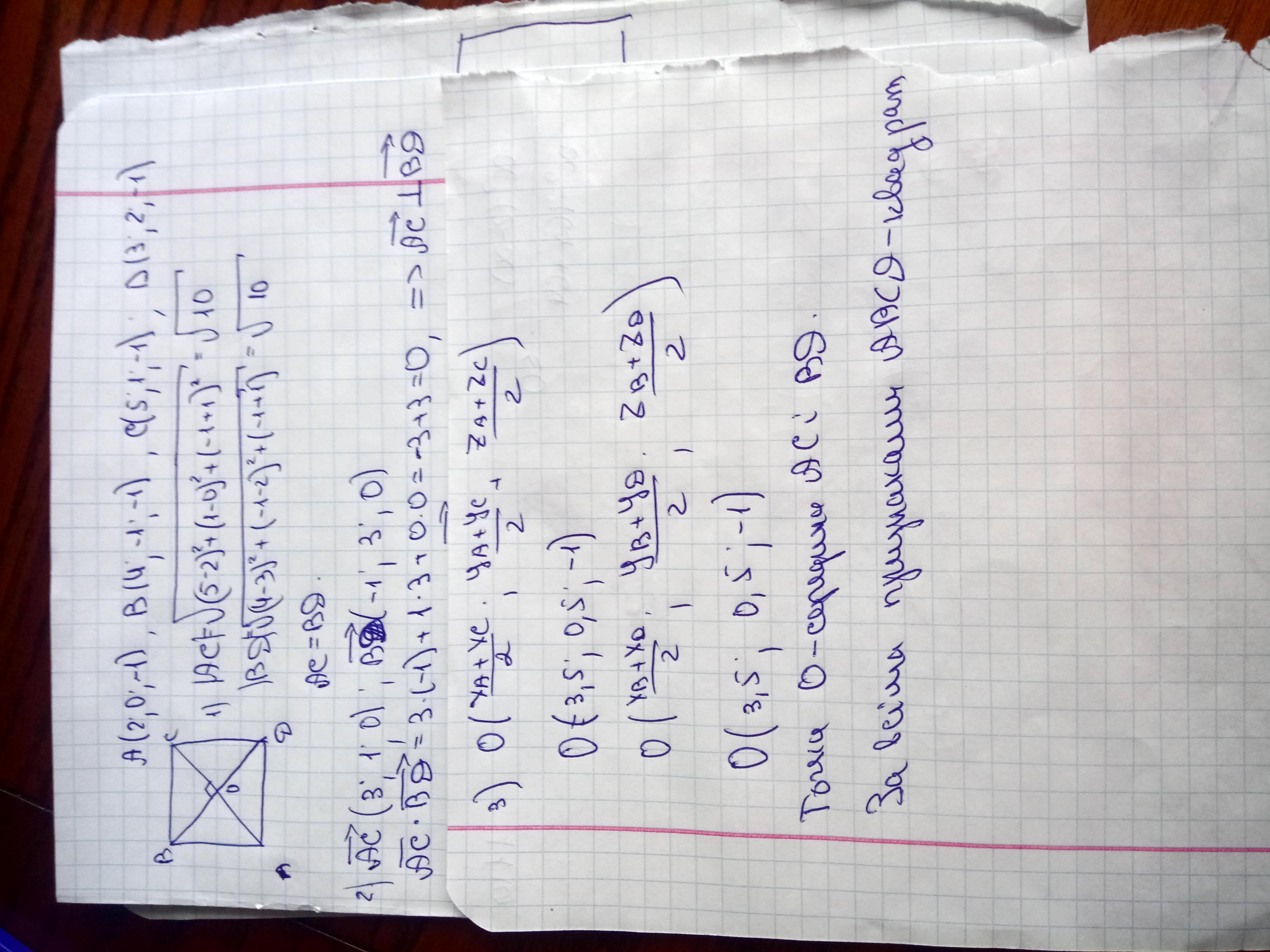 Доведіть що чотирикутник ABCD де A(2; 0; - 1) B(4; - 1; - 1) C(5; 1; - 1) D(3; 2; - 1) є квадратом