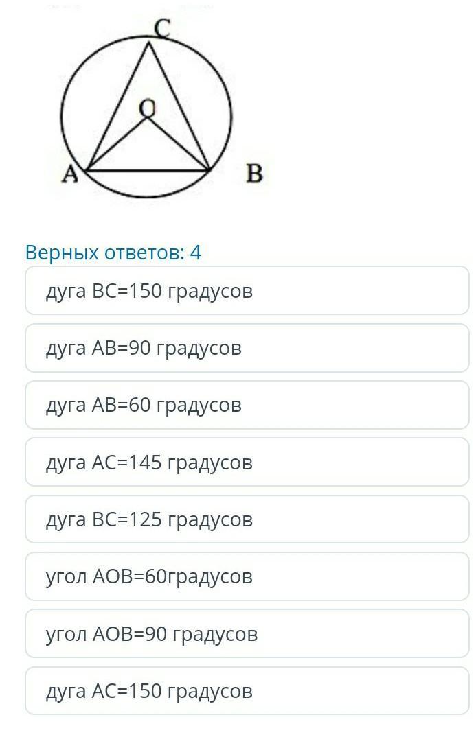 В окружность вписан равнобедренный треугольник АВС.Найдите значение дуг АВ,АС,ВС, если треугольник АВО равносторонний.Срочно.