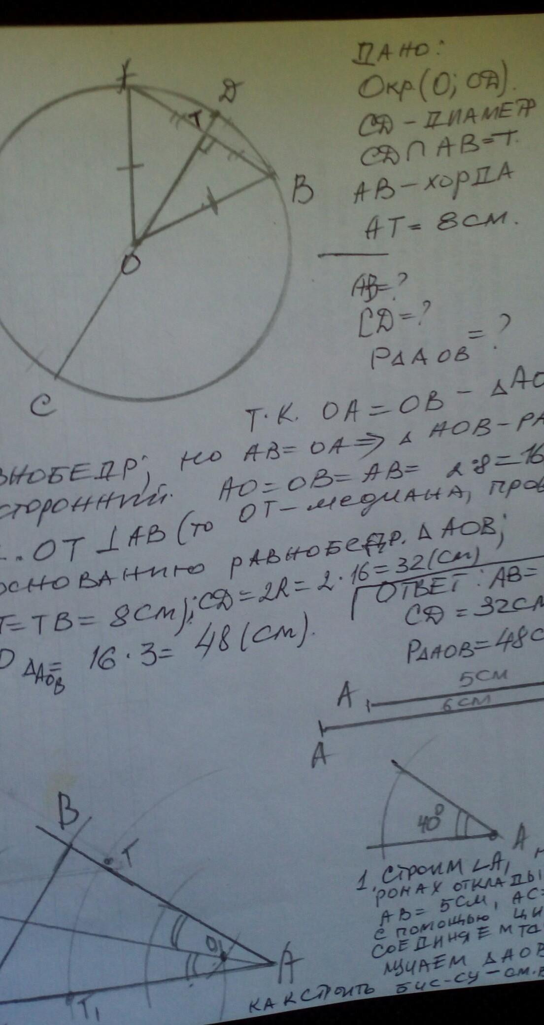 3. окружности с центром в точке О к хорде AB, равной радиусу окружности, перпендикулярно проведен диаметр CD, пересекающиеся в точке Н. Длина отрезка НВ равна 7 см.