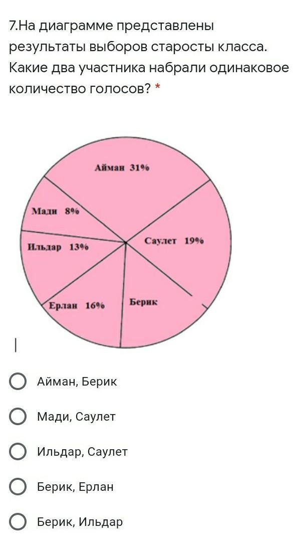 7.На диаграмме представлены результаты выборов старосты класса. Какие два участника набрали одинаковое количество голосов? *