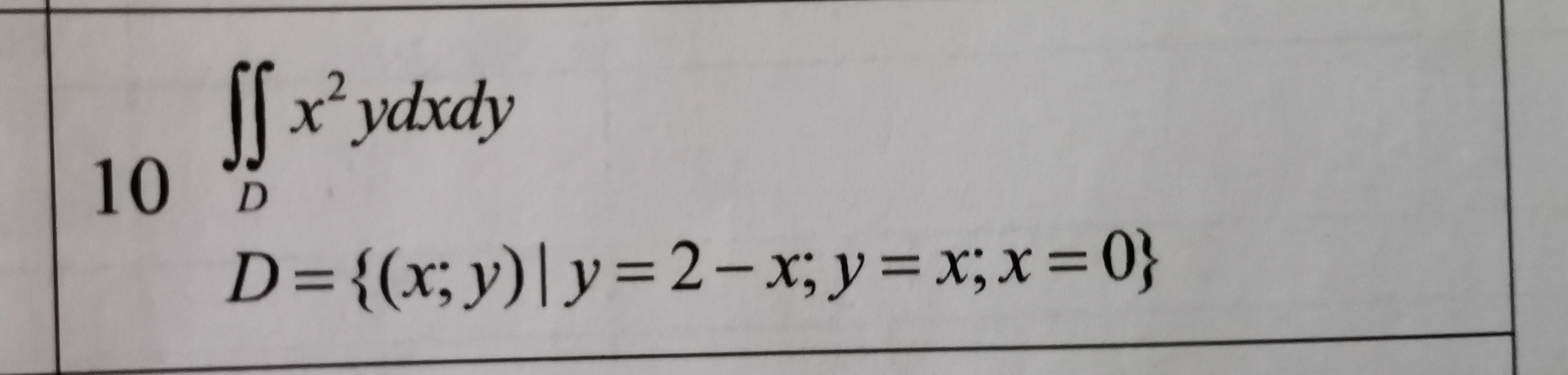 ∫_0^1 ∫_у^(2-у) ух^2dxdy=∫_0^1 y(1/3x^3)|_у^(2-у) dy = ∫_0^1 y/3 ((2-y)^3-y^3)dy = 1/3 ∫_0^1 y(8-12y+6y^2-y^3-y^3)dy=1/3 (4y^2-4y^3+6/4 y^4-2/5 y^5)|_0^1 =1/3 (4-4+6/4-2/5)=1/3 × 22/20=11/30