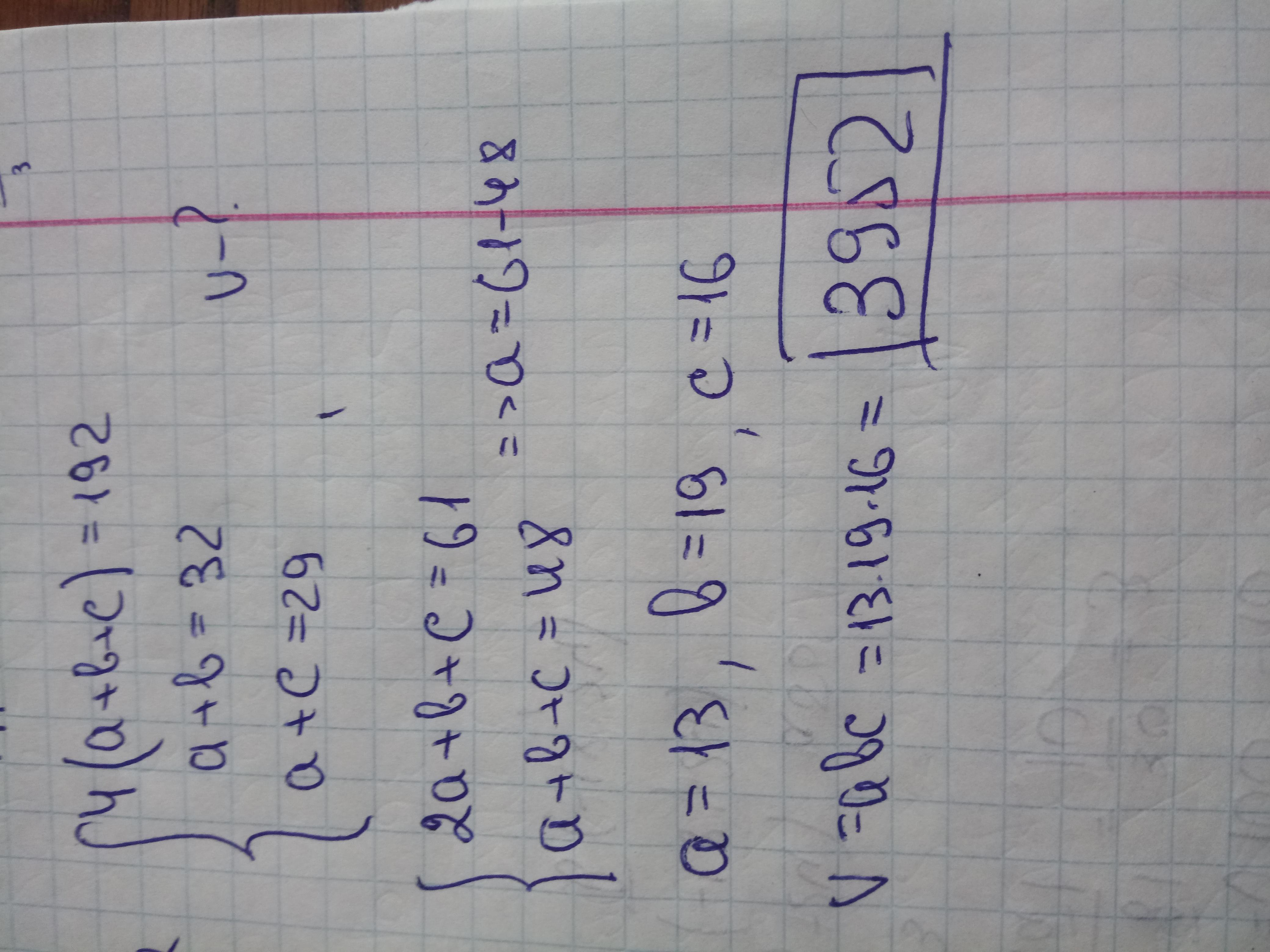 Сумма длин всех ребер прямоугольного параллелепипеда 192 см. Сумма длины и ширины равна 32 см, а сумма высоты и длины - 29 см. Вычислите объем прямоугольного параллелепипеда. *