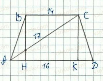 Задача:Найдите площадь равнобокой трапеции основание которой равны 14 см и 16 а диагональ 17 см Но мне нужна только средняя линия