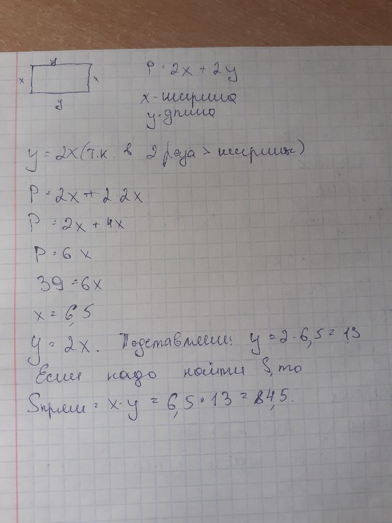 ширина прямоугольника в 2 раза меньше его длины сторон прямоугольника переиметр который равен 39 см