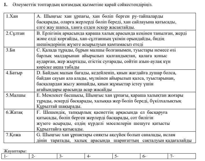 Әлеуметтік топтардың қоғамдық қызметіне қарай сәйкестендіріңіз. 1.Хан А. Шыңғыс хан ұрпағы, хан бөліп берген ру-тайпаларды басқарады, оларға жерлерді бөліп береді, хан сайлауына қатысады, елге жау шапса, ханға елден әскер жасақтайды. 2.Сұлтан B. Ерлігінің арқасында қараша халық арасында кеңінен танылған, жерді және елді қорғайды, хан-сұлтанның үкімін орындайды, бидің шешімдерінің жүзеге асырылуын қамтамасыз етеді 3.Би C. Қалада тұрады, бұрын малшы болғанымен, туыстары немесе өзі барлық малдарынан айырылып қалғандықтан, қалаға қоныс аударған, жер жыртады, егістік суғарады, сөйтіп азын-аулақ күн көріске ақша табады 4.Батыр D. Байдың малын бағады, кедейленіп, қиын жағдайға душар болса, байдан сауын ала алады, мүлкінен айырылып қалса, туыстарынан, басқалардан жылу жинайды, қиын жұмыстар істеу үшін ағайындары арасында асар жасайды 5.Малшы E. Мемлекет басшысы, Шыңғыс хан ұрпағы, қараша халықтан жоғары тұрады, әскерді басқарады, халыққа жер бөліп береді, бүкілхалықтық Құрылтай шақырады. 6.Жатақ Ғ. Шешендік, тапқырлық қасиеттің арқасында ел басқаруға қатысады, бөліп берген жерлерді басқарады, сот билігін жүзеге асырады, елдің күрделі мәселелерін шешуге қатысты Құрылтайға қатысады. 7.Қожа G. Шыңғыс хан ұрпақтары сияқты ақсүйек болып саналады, ислам дінін таратады, халық арасында шариғаттың сақталуын қадағалайды Жауаптары: 1- 2- 3- 4- 5- 6- 7-