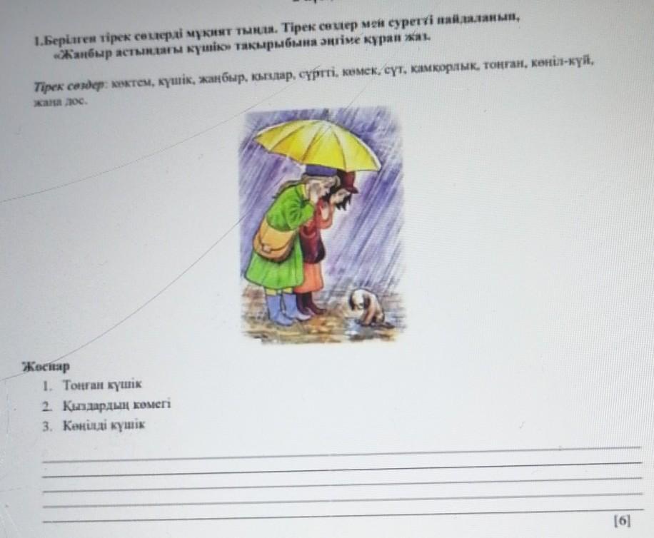 Ответ:көктем келді.Далада жаңбыр жауып жатыр.Айжан мен Аружан даладан күшік тауып алады.Ол күшік тоңып қалыпты.Қыздар оған көмектеспек болып өздерімен алып кетеді.Оны жуындырып,сүртіп сүт береді.Қыздар оған қамқор болады.Күшіктің көңіл-күйі тап сол сәтте көтеріледі.Енді қыздармен күшік дос болады