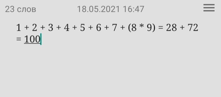 между цифрами 1 2 3 4 5 6 7 8 9 нужно раставить арефметические знаки и скобки чтоб получилось число 100