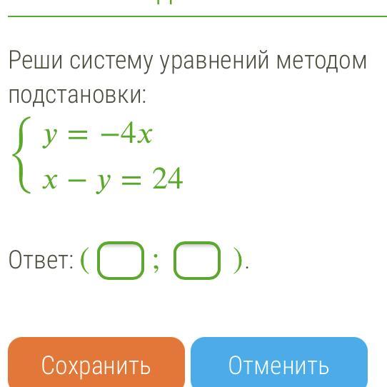 - х-(-4х)= 24 х+4х=24 5х=24 х=4,8. теперь подставляем в первое:у=-4×4,8 у=-19,2.
