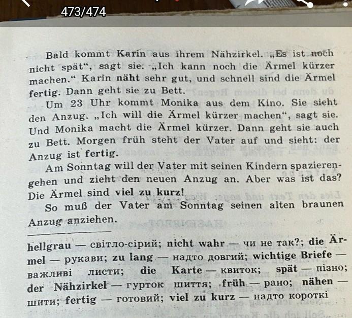 Ответ: Скоро Карин выйдет из своего швейного кружка. Еще не поздно, - говорит она, - я могу сделать рукава короче ». Карин очень хорошо шьет, рукава заканчиваются быстро. Потом она ложится спать. В 23 часа Моника выходит из кинотеатра. Она видит костюм. «Хочу сделать рукава короче», - говорит она. А Моника укорачивает рукава. Потом тоже ложится спать. Утром отец встает и видит: костюм готов. В воскресенье отец хочет пойти за гулять с детьми. встать и надеть новый костюм. но что это? рукава слишком короткие! так что отец должен надеть свой старый коричневый костюм в воскресенье.