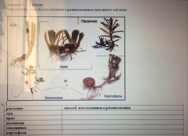 Растение:Лук, ирис, паланхия, земляника, картофель.