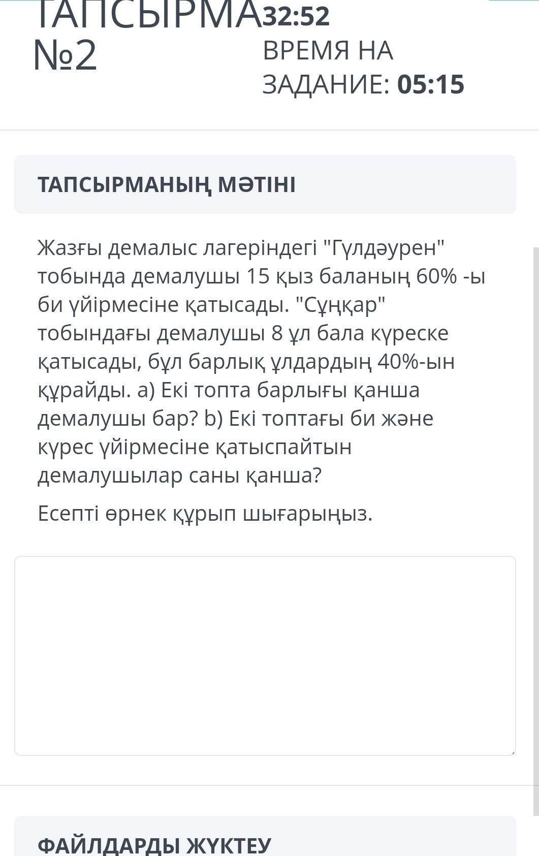 Жауабы:Би үйірмесіне қатыспайтын демалушы саны 4-еу, ал күрес үйірмесіне қатыспайтын демалушы саны 5-еу