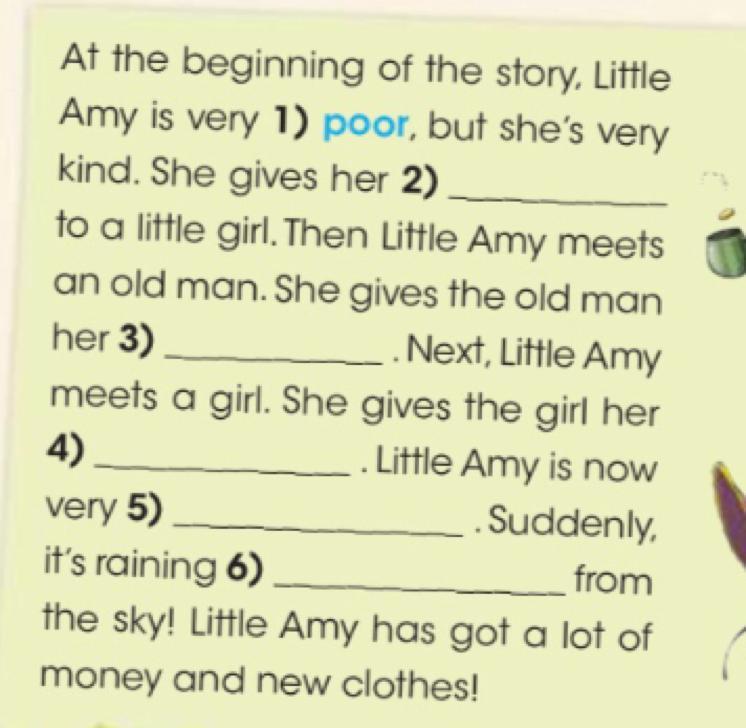 В начале истории Маленькая Эми очень 1) бедна, но очень добра. Она дает ее 2)______ маленькой девочке. Затем Маленькая Эми встречает старика. Она дает старику свои 3)______. Далее Маленькая Эми встречает девушку. Дает девушке свои 4)_______. . Маленькой Эми сейчас очень 5)_____ идет дождь 6)____. Вдруг с неба! У маленькой Эми много денег и новой одежды!