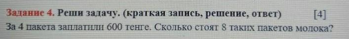За 4 пакета заплатили 600 тенге. Сколько стоят 8 таких пакетов молока?