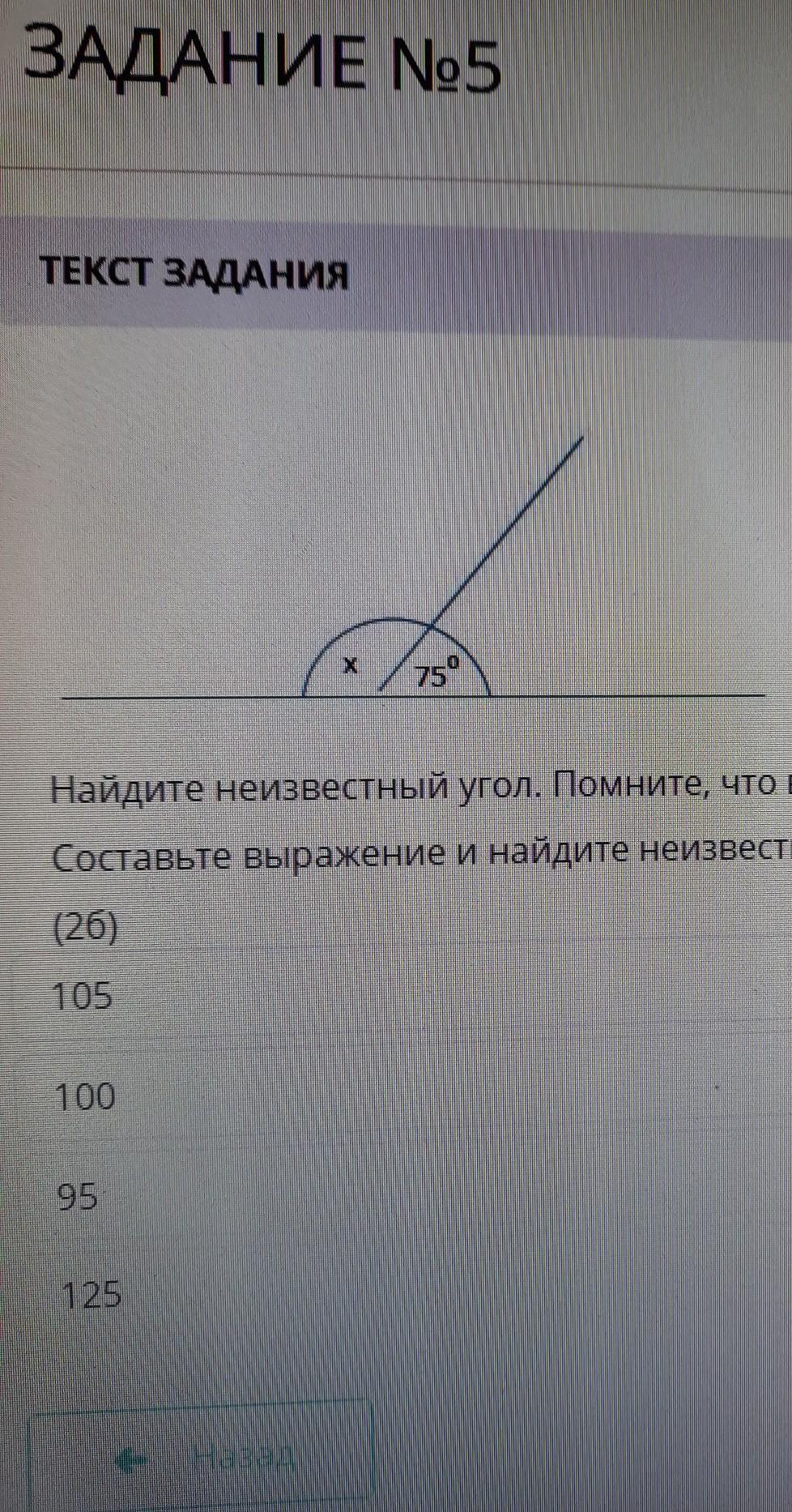 так как развёрнутый угол(180°), то мы минусуем 75° из 180°= 105°
