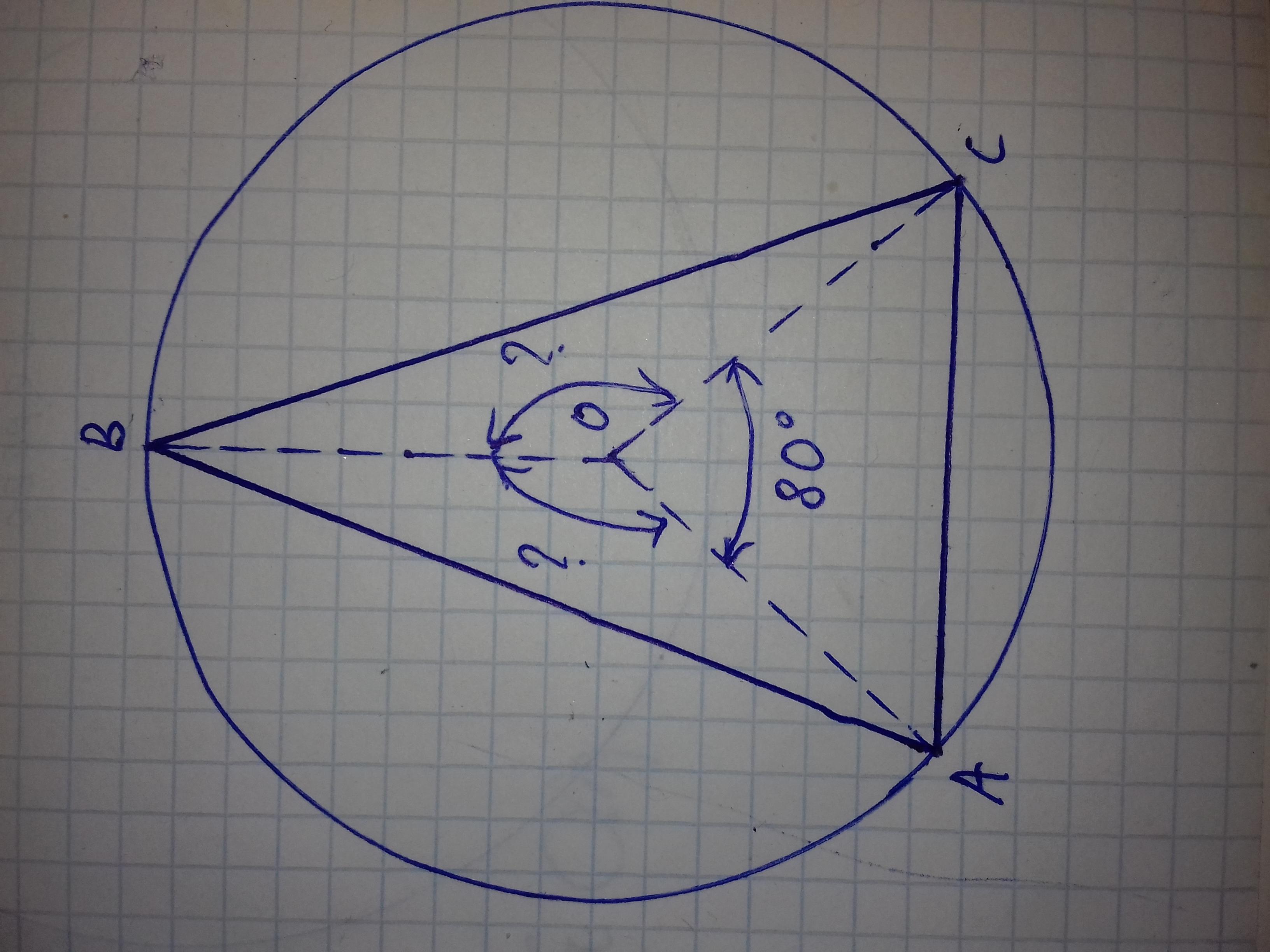 окружности, причем основание АС этого треугольника стягивает дугу 80°