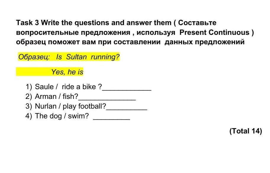 Task 3 Write the questions and answer them ( Составьте вопросительные предложения , используя Present Continuous ) образец поможет вам при составлении данных предложений