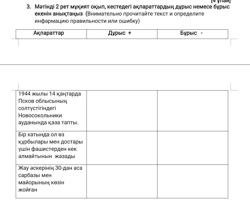 Мәтінді 2 рет мұқият оқып, кестедегі ақпараттардың дұрыс немесе бұрыс екенін анықтаңыз (Внимательно прочитайте текст и определите инфармацию правильности или ошибку