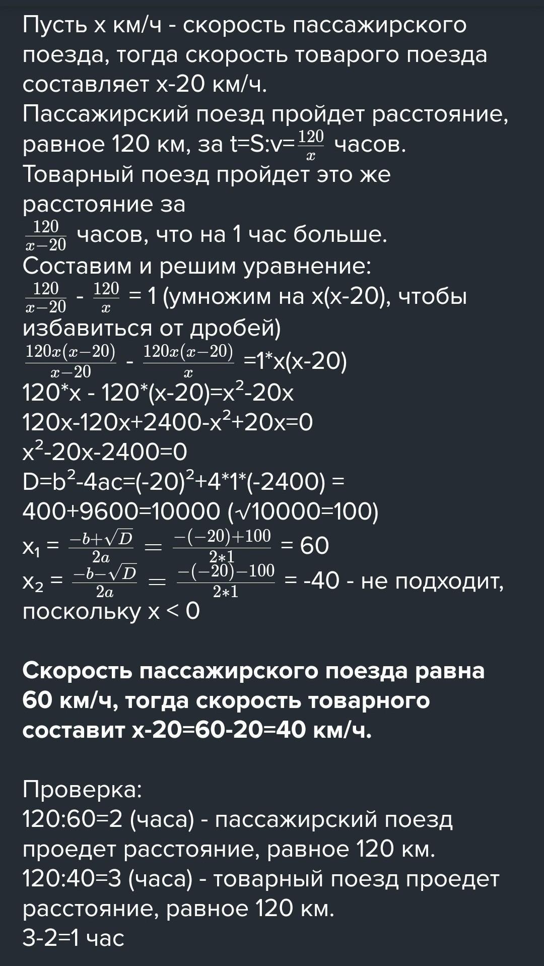 Пассажирский поезд проходит расстояние равное 120 км, на 1 час быстрее, чем товарный.Найдите скорость каждого поезда. если скорость товарного поезда на 20 км/ч меньше скорости пассажирского.