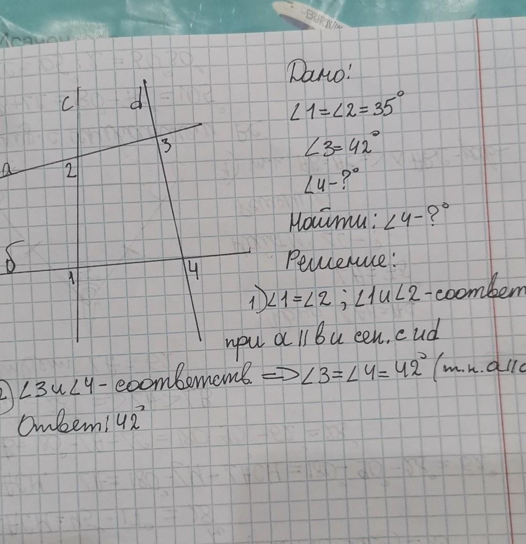 СРОЧНО СРОЧНО угол 1 равен углу 2 равно 35 градусов угол 3 равен 42 градусов найти угол 4