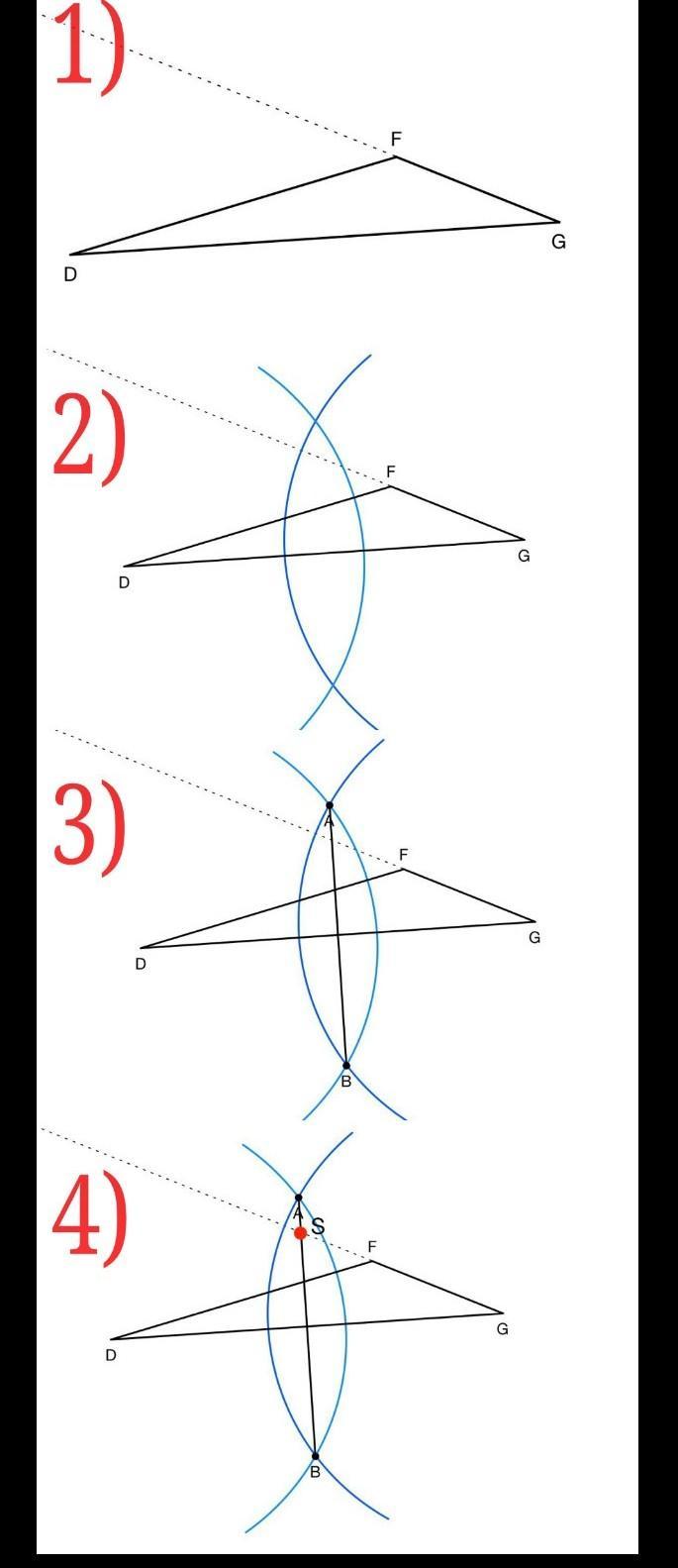 2) Построить срединный перпендикуляр можно по двум точкам пересечения окружностей равных радиусов и центрами в т.D и т.G. (R должен быть больше ½DG)