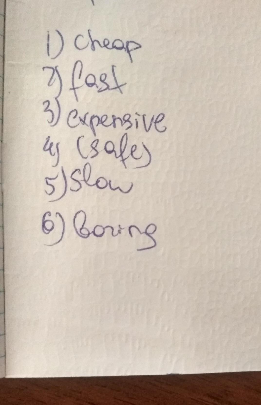 Comfortable; safe; fast; expensive; slow; cheap; boring;