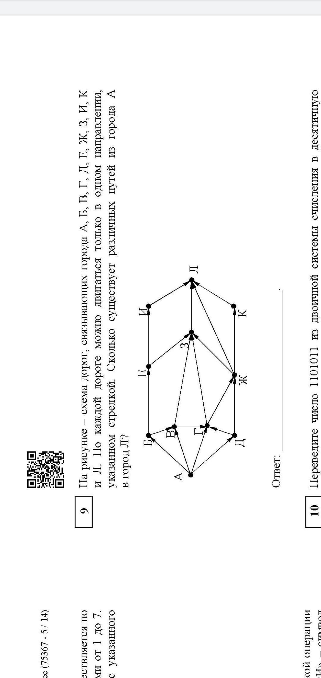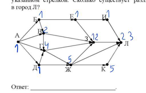 На рисунке – схема дорог, связывающих города А, Б, В, Г, Д, Е, Ж, З, И, К и Л. По каждой дороге можно двигаться только в одном направлении, указанном стрелкой. Сколько существует различных путей из города А в город Л?