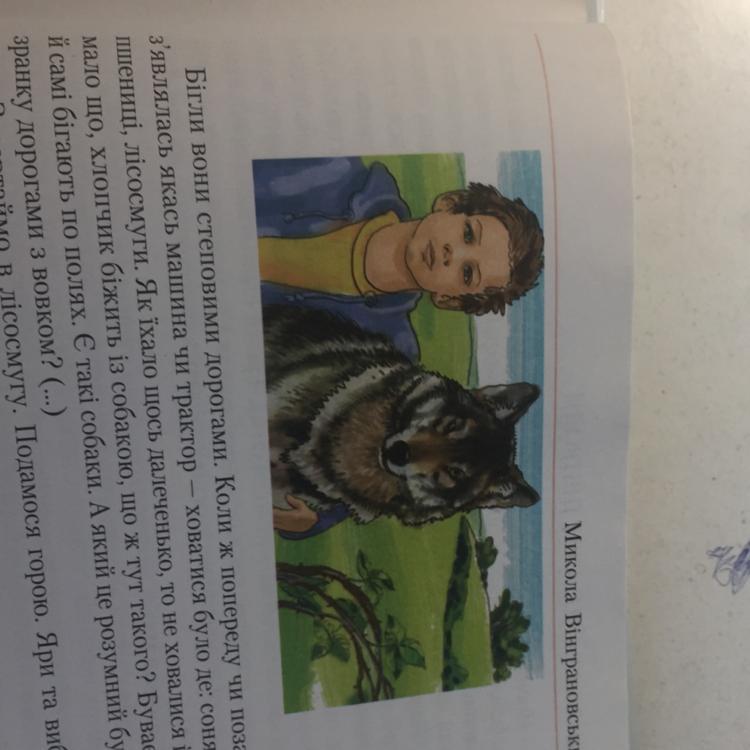 На этой картинке изображены мальчик с собакой(или же волком?). Мальчик обнимает своего четвероногого друга. Они сидят где то в живописном месте. На заднем плане виден красивый пейзаж. Мальчик и собака задумчиво и уверенно смотрят вперёд. Видно что там ясная и тёплая погода.