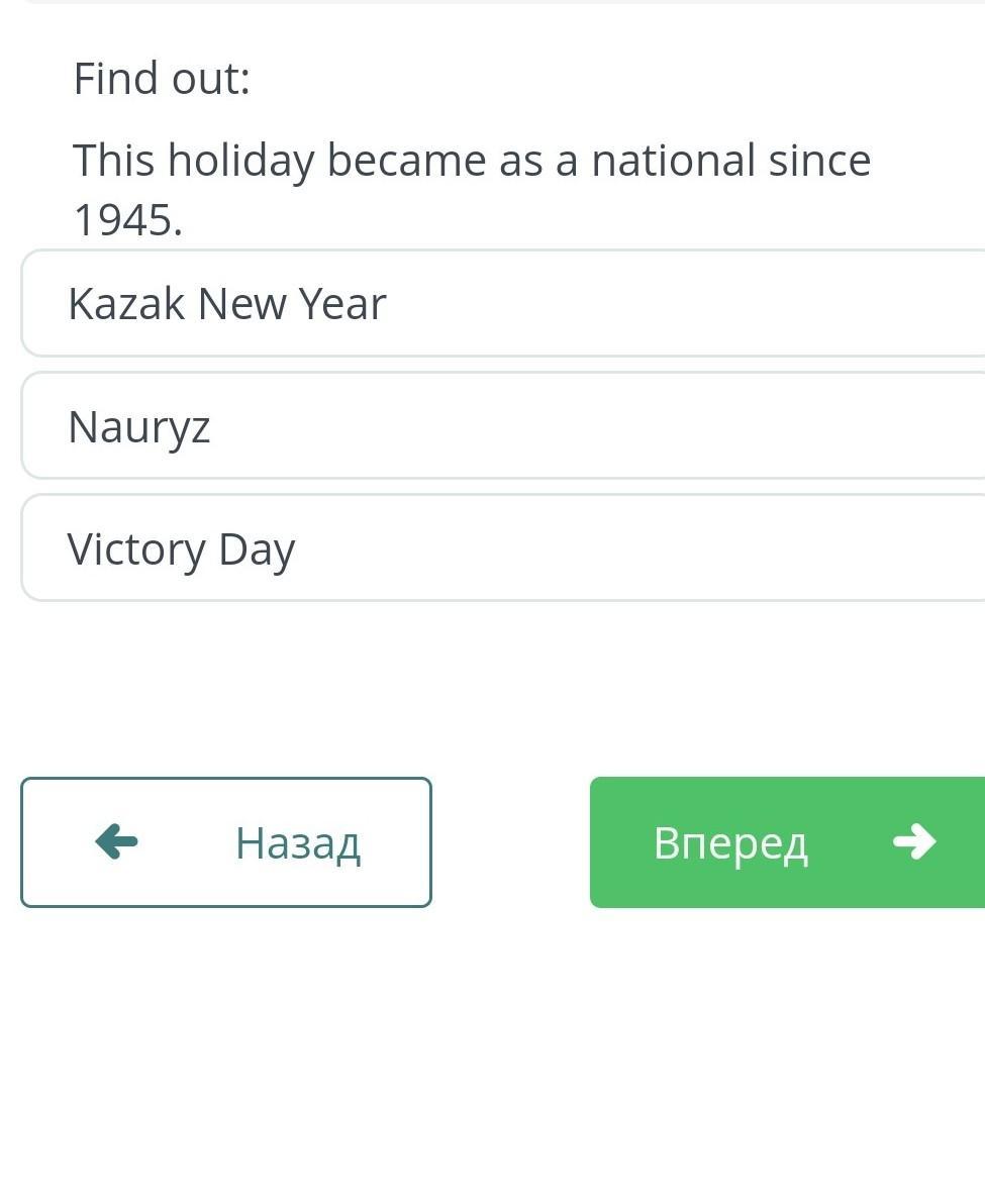 Find out: This holiday became as a national since 1945. Kazak New Year Nauryz Victory Day
