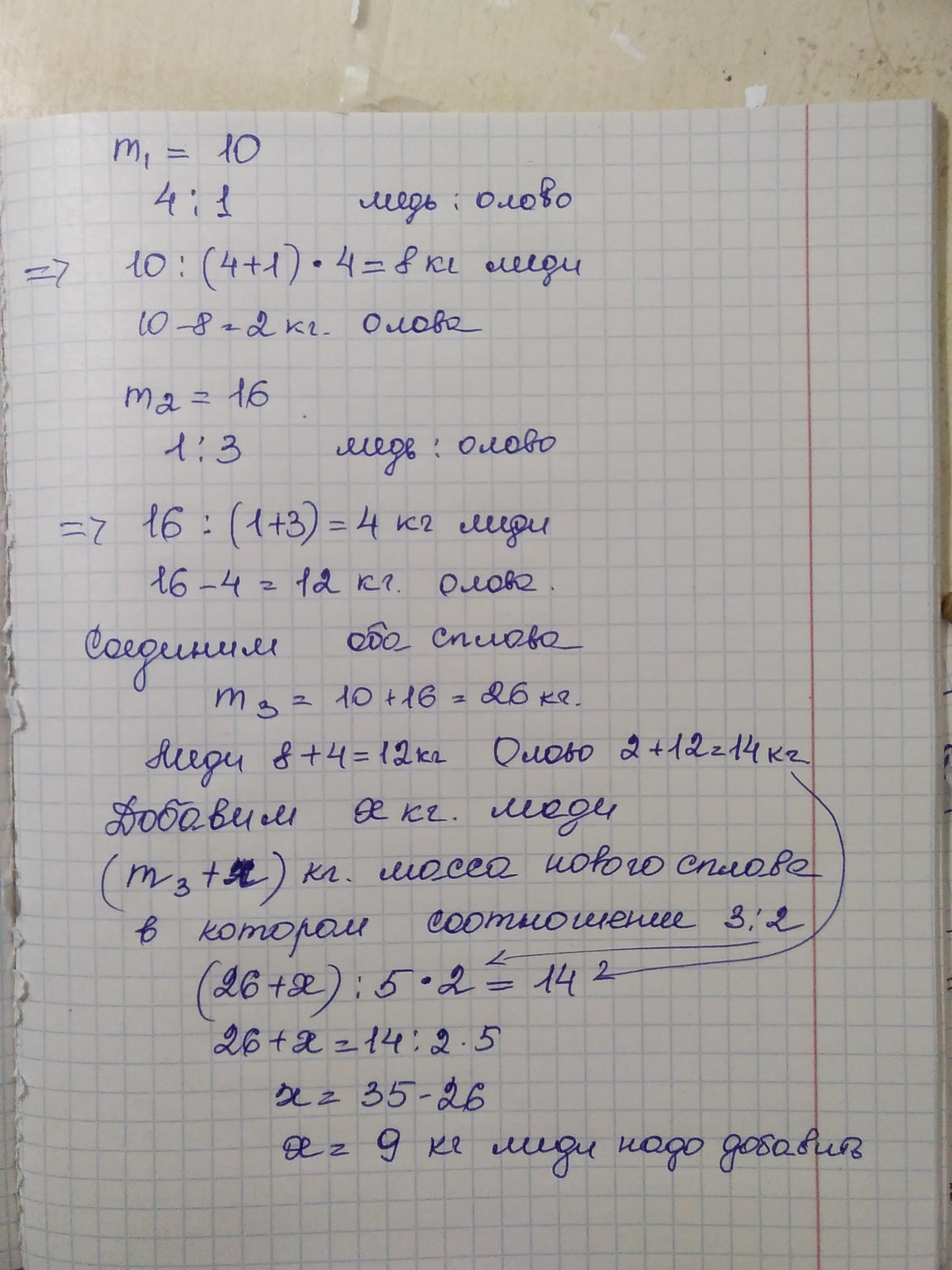 Сплавили два сплава . В первом сплаве весом 10 кг отношение меди к олову равно 4 / 1 во втором сплаве весом 16 кг отношение меди к олову равно 1 : 3 Сколько надо добавить чистой меди к получившемуся сплаву чтобы получить сплав в котором отношение меди к олову равно 3 : 2