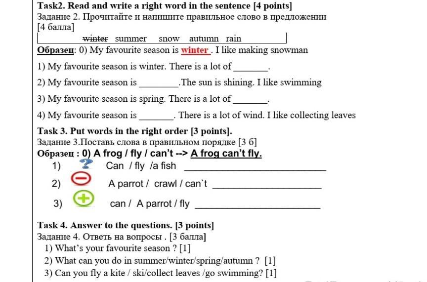 2) In summer i can swimming, play football, volleyball, basketball, ride a bike. In winter i can skiing, skating, play hockey.