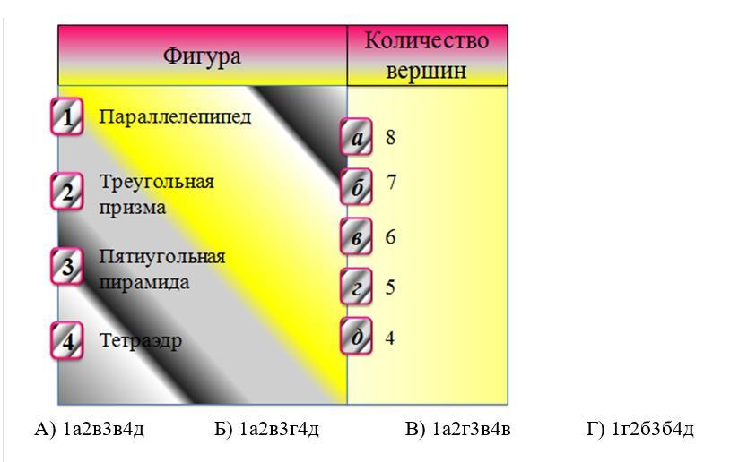 Установи соответствие между геометрической фигурой и количеством её вершин. Учитывай, что буквы второго столбца могут повторяться или не использоваться вообще.