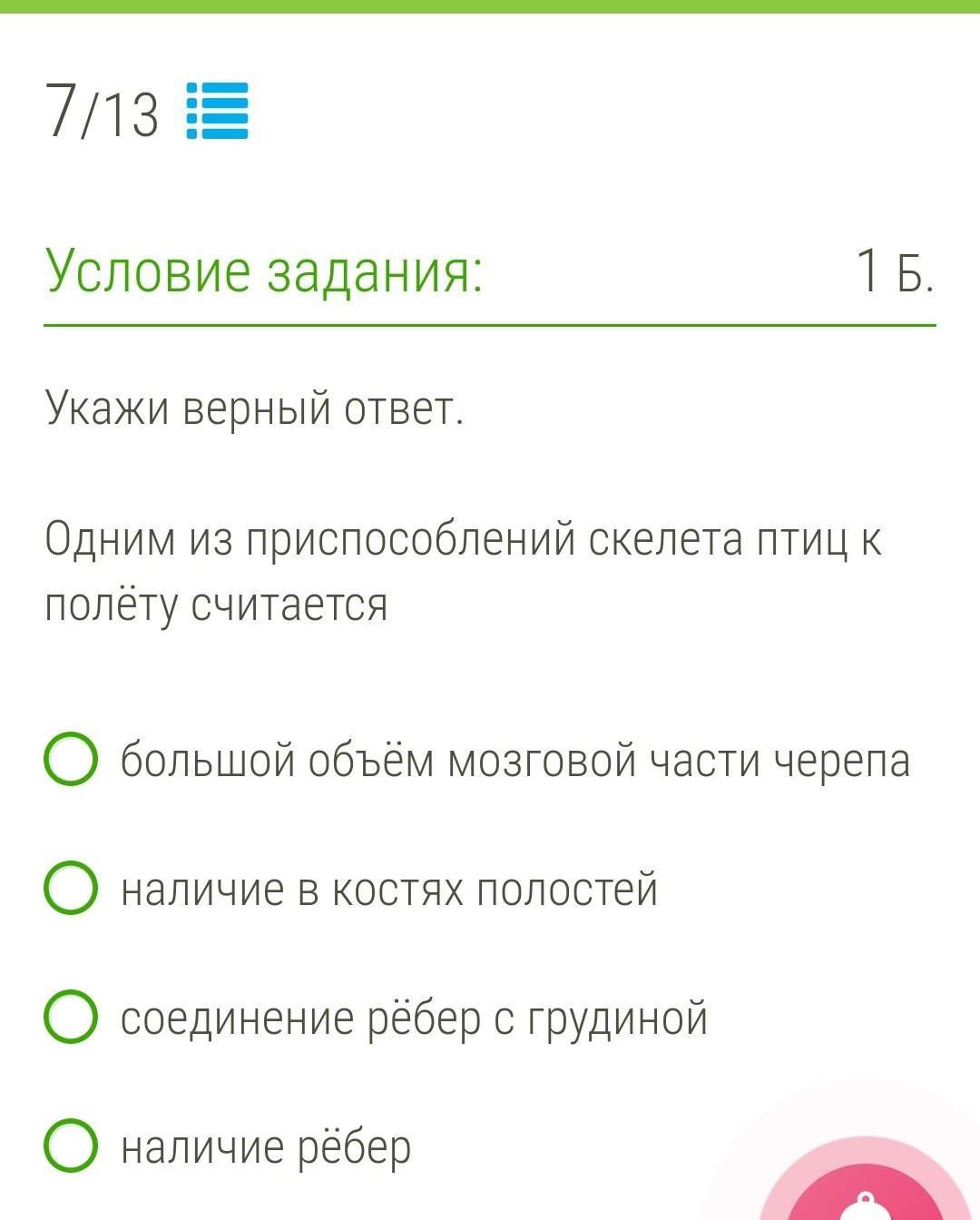 кости тонкие с воздушными полостями; передние конечности превратились в крылья; срастание костей черепа, поясничных, крестцовых и хвостовых позвонков, костей тазового пояса и ключиц; грудина имеет вырост — киль; кости предплюсны и плюсны срослись в цевку; челюсти превратились в клюв.
