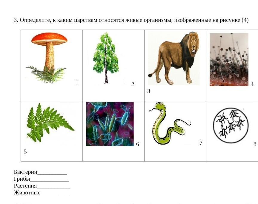 . Определите, к каким царствам относятся живые организмы, изображенные на рисунке (4)