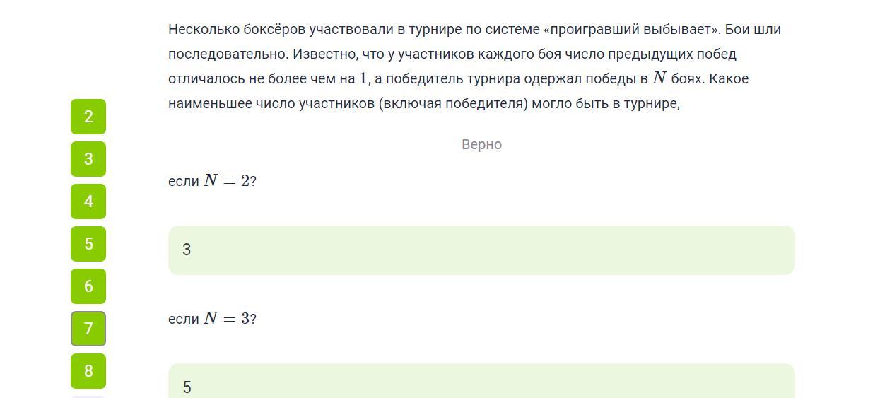 Несколько боксёров участвовали в турнире по системе «проигравший выбывает». Бои шли последовательно. Известно, что у участников каждого боя число предыдущих побед отличалось не более чем на 1 1 , а победитель турнира одержал победы в N боях. Какое наименьшее число участников (включая победителя) могло быть в турнире, если =2 N = 2 ? Если N = 3? СРОЧНО. ЗАДАНИЕ С СИРИУСА