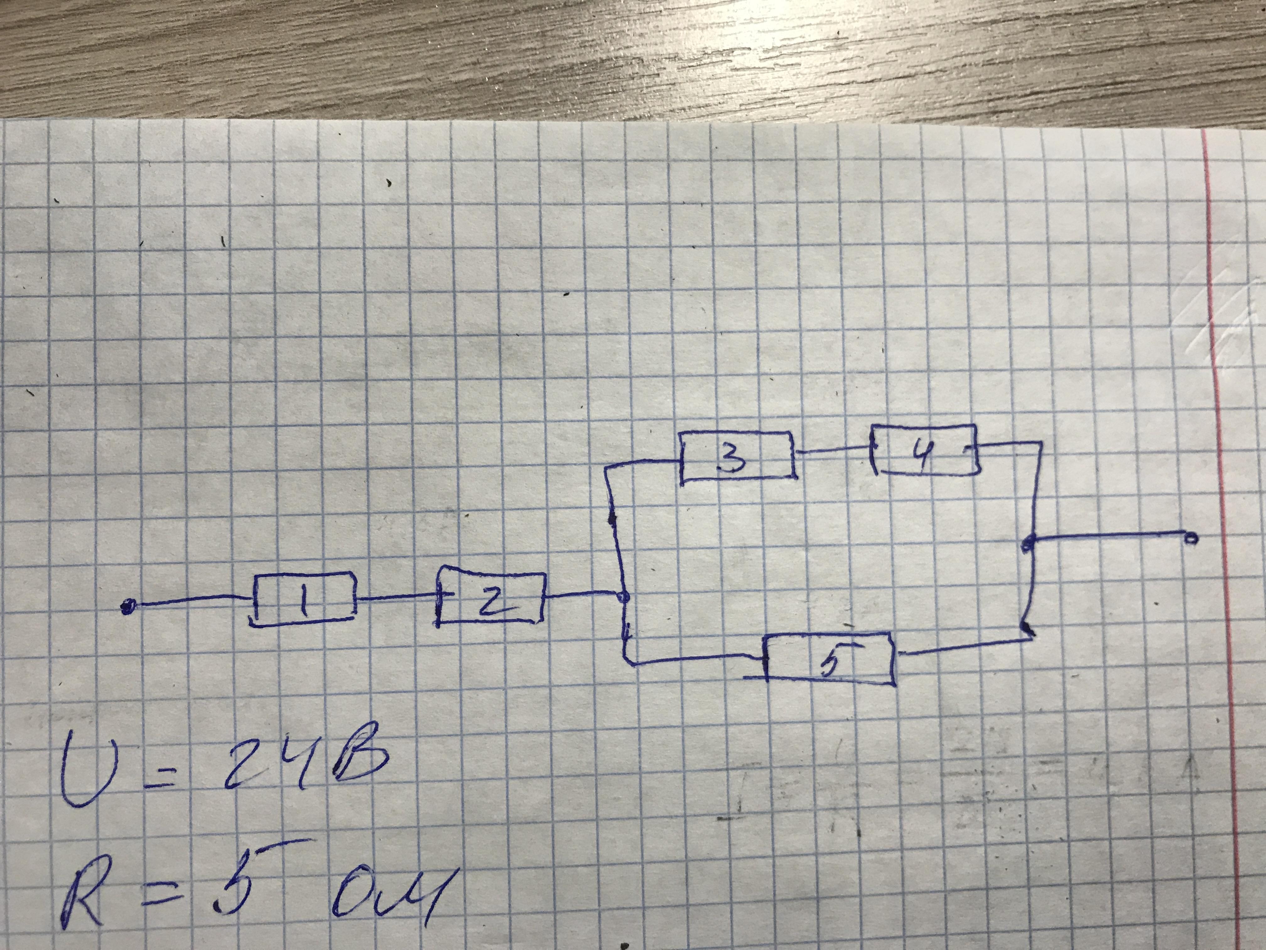 Rобщ=R1+R2+R(3-5)=5+5+3,3=13,3 Ом.