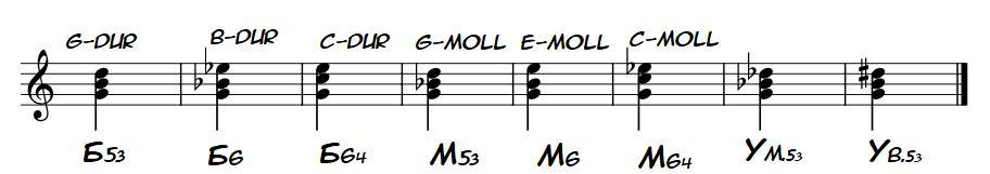 2) Тут уже со всеми знаками, поскольку аккорды мы строим не в тональности, а от ноты. Сверху подписал тональности, в которых находятся эти аккорды. Не знаю, проходили ли вы уже буквенные обозначения тон-ей; если нет - лучше подпиши словами (соль мажор, си-бемоль мажор, до мажор, соль минор, ми минор и до минор соответственно), иначе у учителя возникнут вопросы, откуда ты уже успел узнать буквенные обозначения :)